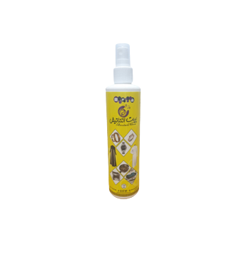 يرش المحلول على المنطقة المراد تنظيفها ويترك لفترة زمنية من 1-3 دقايق، ثم يفرك بواسطة اليد مع استخدام القفاز ) في حال الملبس أو الفرشاة أو الأسفنج ثم يغسل بالماء