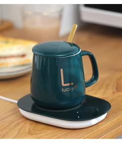 فنجان من السيراميك الفاخر مع قاعدة تسخين ترموستات ذكي لتسخين المشروبات الساخنة القهوة والحليب والاكواب بسعة 350 مل للمكتب والمنزل بطبقة سفلية عازلة واستطاعة 18 واط بتصميم تحكم باللمس لضمان الامان
